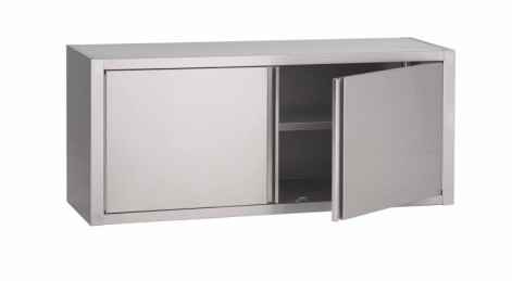 Armoires murales en inox de 0.8 mm d’épaisseur avec une tablette intermédiaire réglable et des portes battantes doublées à poignées profilées sur toute la hauteur. Fixations avec des baïonnettes en inox de 1,5 mm d’épaisseur à l’arrière.