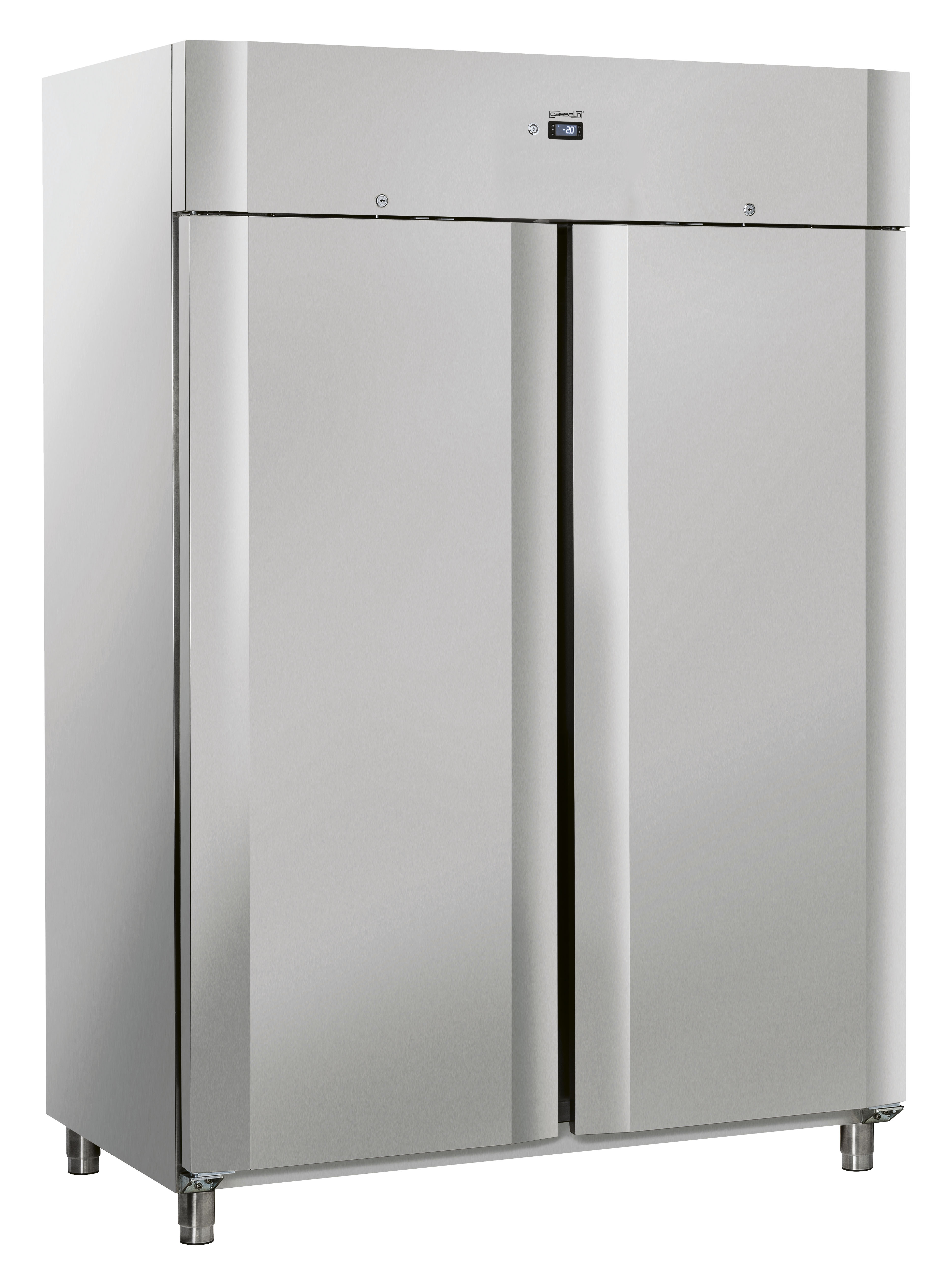- Acier inoxydable - Froid ventilé - Évaporateur avec traitement anti-corrosion - Encadrement anti-condensation - Agent moussant Cyclopentane (80 mm par côté) - Dégivrage par gaz chauds - Éclairage LED - Verrouillage porte par clé - Portes à fermeture automatique - Interrupteur ON/OFF - 8 étagères réglables pour GN 2/1 - Thermostat digital - Température réglable de -2°C à +8°C - Classe climatique : 4 - Capacité net : 820 L - Capacité commerciale : 1 255 L - Fluide réfrigérant : R 290 - Puissance : 286 W / 230 V - Dimensions : L 1 400 x P 823 x H 2 045 mm - Poids : 165 Kg