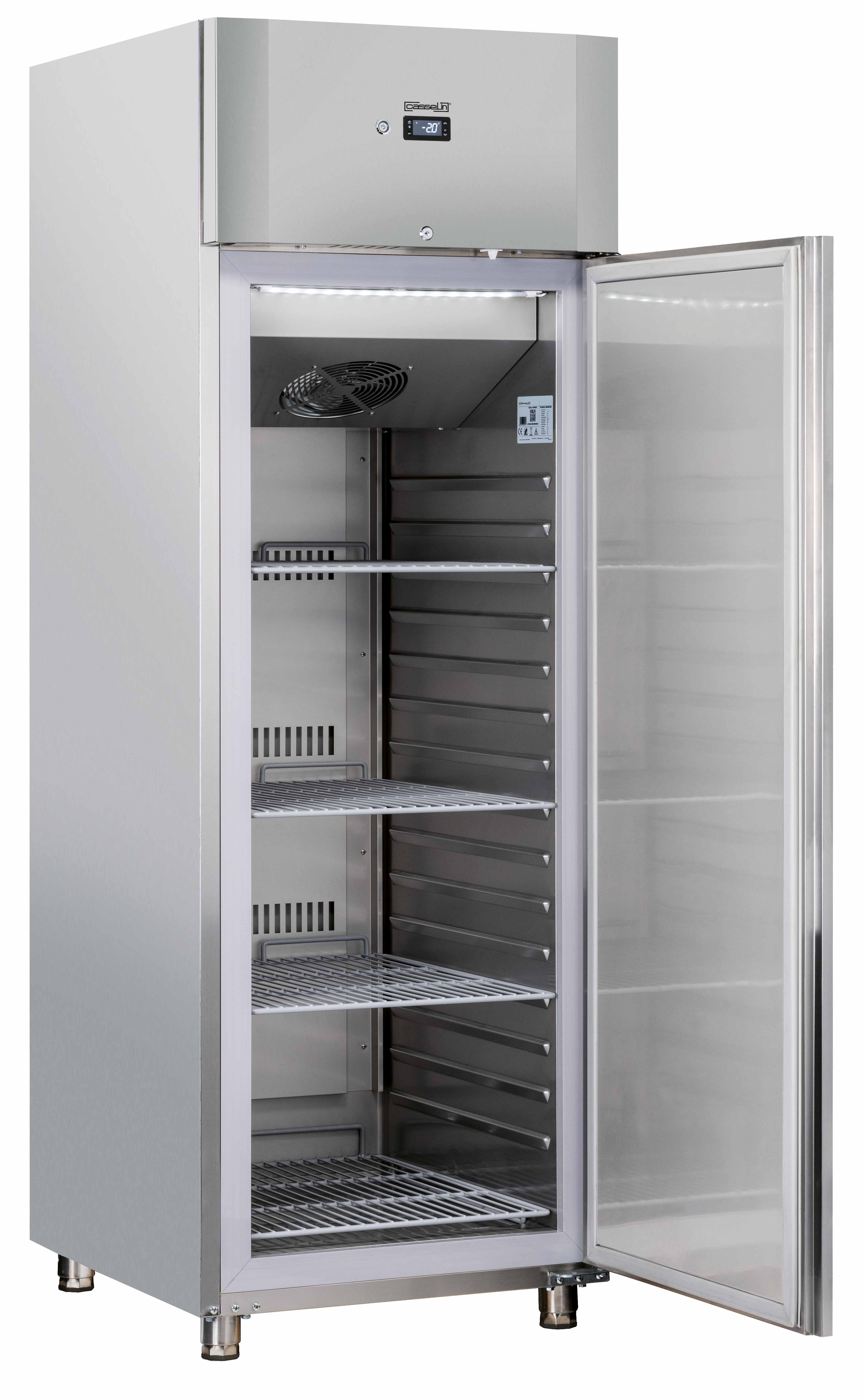 - Acier inoxydable - Froid ventilé - Évaporateur avec traitement anti-corrosion - Encadrement anti-condensation - Agent moussant Cyclopentane (80 mm par côté) - Dégivrage par gaz chauds - Éclairage LED - Verrouillage porte par clé - Porte à fermeture automatique - Porte réversible - Interrupteur ON/OFF - 4 étagères réglables pour GN 2/1 - Thermostat digital - Température réglable de -2°C à +8°C - Classe climatique : 4 - Capacité net : 410 L - Capacité commerciale : 546 L - Fluide réfrigérant : R 290 - Puissance : 210 W / 230 V - Dimensions : L 700 x P 823 x H 2 045 mm - Poids : 108 Kg