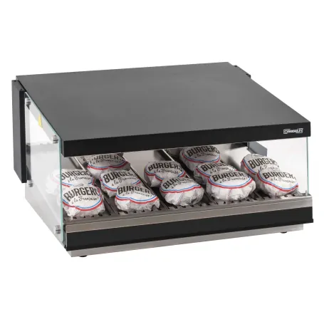 - Acier inoxydable peint à l'époxy en noir - Plan de stockage incliné - Étagère chauffante par résistance - Température sous résistances de 30°C à 90°C - Réglage de la puissance de chauffe par thermostat - Réglage de la largeur des couloirs - Puissance lampes : 30 W - Puissance : 580 W / 230 V - Dimensions : L 800 x P 707 x H 430 mm - Poids : 26 Kg