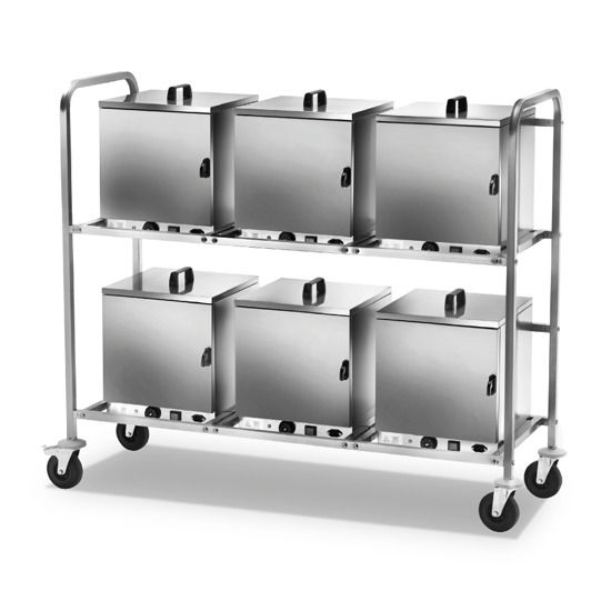 Structure en acier inox mm 25x25. Glissières pour no.6 boîtes thermiques et leur prises électriques. Roues Ø 125, dont 2 avec frein.