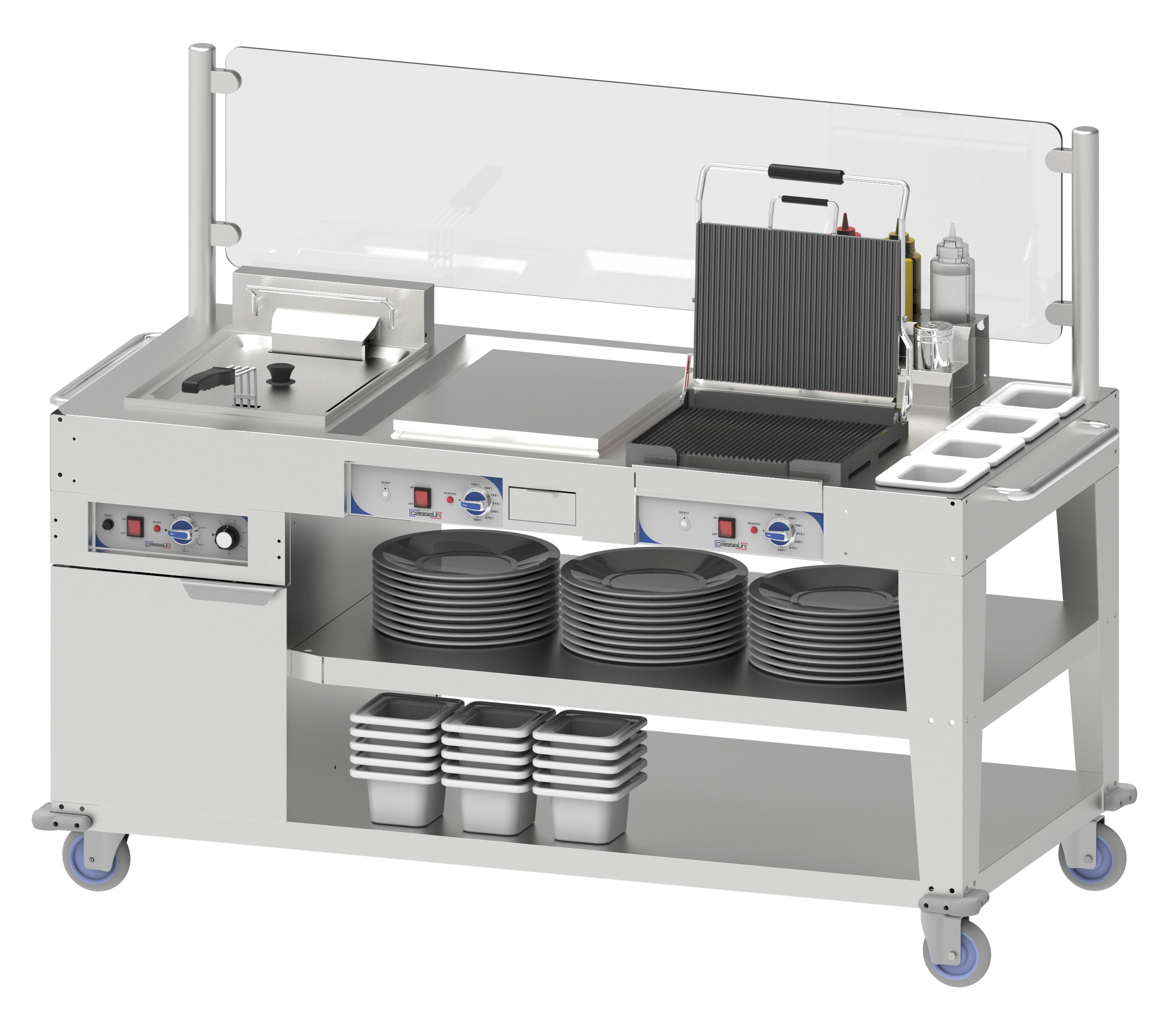 - Acier inoxydable - Vitre de protection en verre trempé amovible - 1 friteuse 12 Litres (9 000 W / 400 V) - 1 plaque à snacker lisse 381 x 510 mm (3 600 W / 230 V) - 1 grill panini rainuré/rainuré 290 x 380 mm (2 400 W / 230 V) - Inclus : 4 pots en porcelaine, 1 support à bouteilles à sauce et épices - Bac de récupération d'huile à l'intérieur du support sous la friteuse - 2 bacs récupérateurs de déchets pour la plaque à snacker et le grill panini - 4 roues dont 2 avec frein - Puissance : 15 000 W / 400 V + 230 V + 230 V