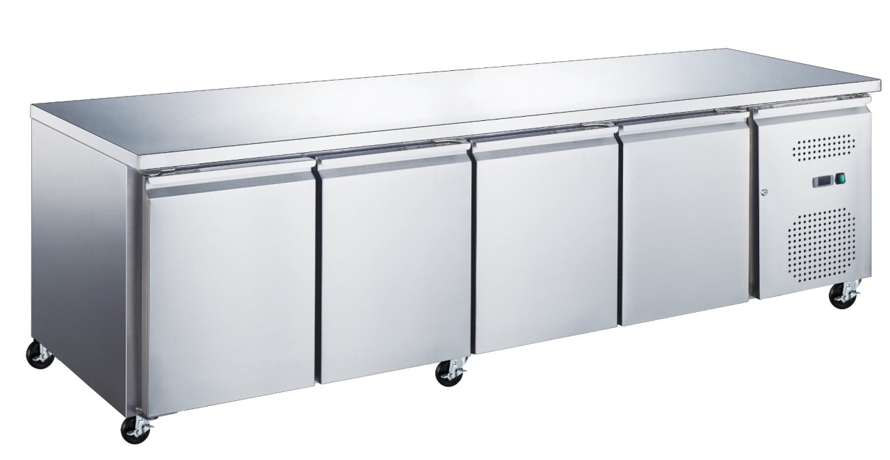 Cet établi de congélation à quatre portes aux finitions soignées offre une grande capacité de congélation et un plan de travail ergonomique. L'établi de congélation dispose de quatre étagères réglables en hauteur et de portes à fermeture automatique.