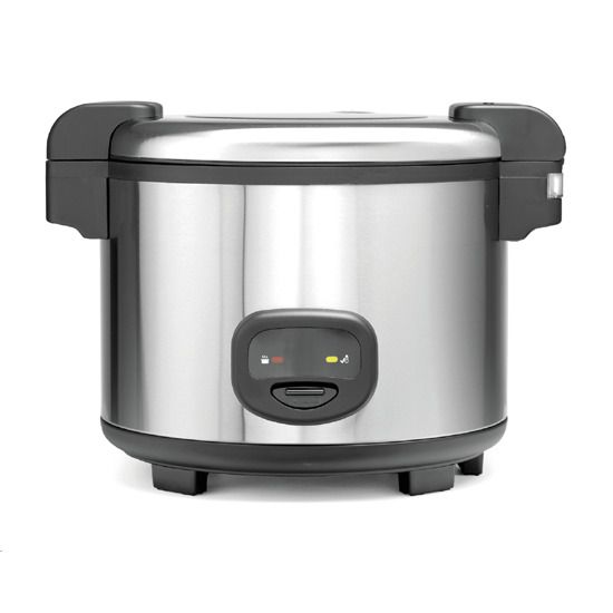Cuiseur à riz électrique 19 litres. Fabrication en acier inox. Bac en aluminium. Poignées latérales. Voyant lumineux de cuisson et chauffage. Contrôle automatique de la cuisson.