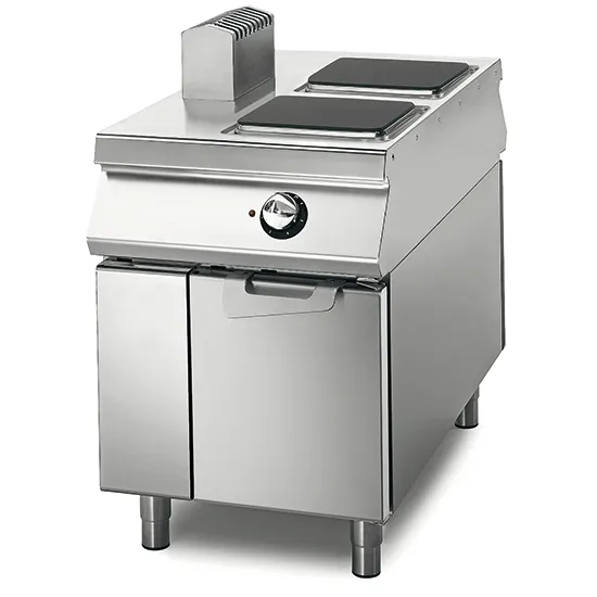 Cuisinière électrique avec 2 plaques sur coffre avec portes, tableau de contrôle sur deux côtés de la marque Virtus, fabriqué en acier inoxydable de haute qualité.