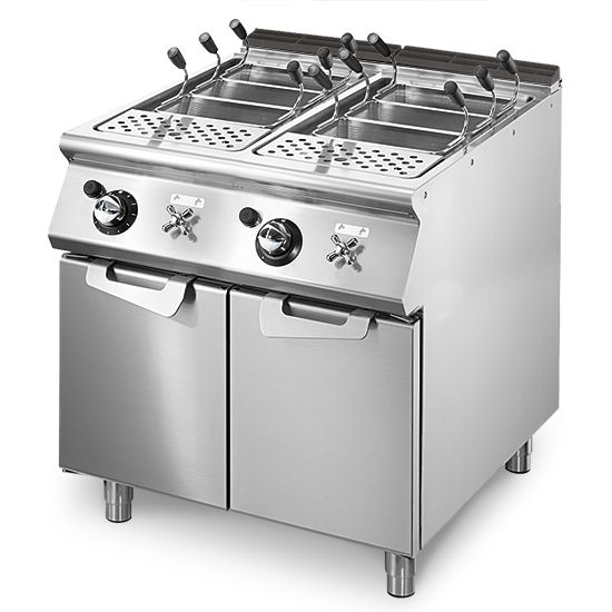 Panneaux latéraux, fond et dos en acier inoxydable. Plan de travail en acier inoxydable AISI 304 20/10. Conduit en fonte émaillée. Puits étirés profonds en acier inoxydable AISI 316 GN 1/1, chaque capacité de 40 litres. Remplissage manuel de l'eau avec robinet installé sur le panneau de commande. Chauffage par brûleur inox situé sous le puits. Gaz fourni par soupape de sécurité avec thermocouple, brûleur pilote et dispositif piézoélectrique pour l'allumage automatique du brûleur. Boutons spécialement conçus pour éviter la pénétration d'eau dans le panneau de commande.Les paniers ne sont pas inclus.