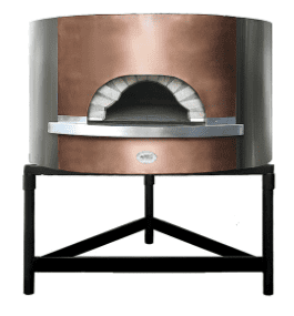 Four traditionnel pour pizzeria modèle Universal. Entièrement isolé. Structure externe en acier inoxydable et/ou avec façades en cuivre usiné (cuivre lisse naturel, cuivre poli brillant, cuivre poli bruni, cuivre poli bruni en briques). Sur demande, le four peut être entièrement recouvert de cuivre lisse naturel ou de cuivre lisse poli. Il ne nécessite aucun travail de finition supplémentaire. La forme cylindrique confère au four une élégance particulière et vous permet d'utiliser au mieux l'espace et d'orienter l'embout buccal afin de faciliter le traitement en fonction de la position de l'établi. Assemblé dans nos locaux par du personnel spécialisé, le four déjà palettisé arrive à la pizzeria, prêt à être utilisé. Déplaçable avec un chariot élévateur et/ou un transpalette manuel. Lorsqu'elle est assemblée, une porte d'accès doit être considérée pour la salle de destination variable en fonction de la taille de la fournaise. Le four est fourni avec une porte à fermeture en bouche.
