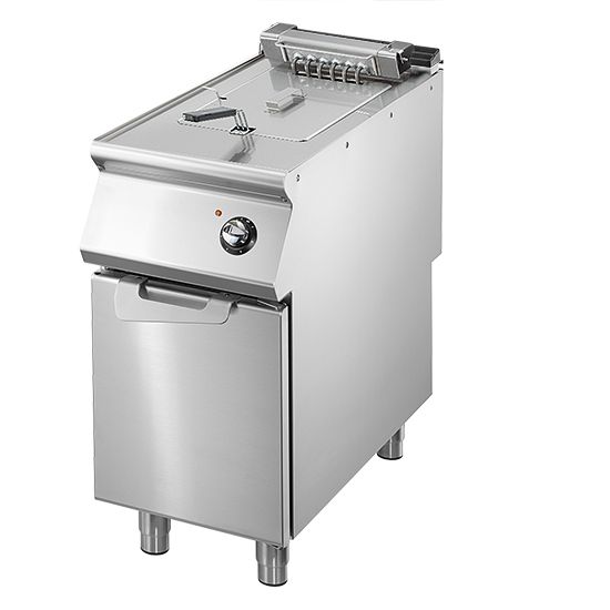 Panneaux latéraux, fond et dos en acier inoxydable. Plateau en acier inoxydable AISI 304 épaisseur 20/10. Puits emboutis en acier inoxydable AISI 304 avec vanne de vidange d'huile installée dans l'armoire inférieure et zone froide pour la collecte des particules alimentaires. Éléments chauffants situés à l'intérieur du puits.Éléments chauffants situés à l'intérieur du puits et relevables pour un nettoyage facile du puits. Contrôle de la température par thermostat mécanique avec réglage jusqu'à 190°C. Thermostat de sécurité à réarmement manuel. Lampe sur le panneau de commande pour indiquer l'activation du chauffage. Boutons spécialement conçus pour éviter la pénétration d'eau dans le panneau de commande.Inclus: Panier et tube d'extension de vidange d'huile.