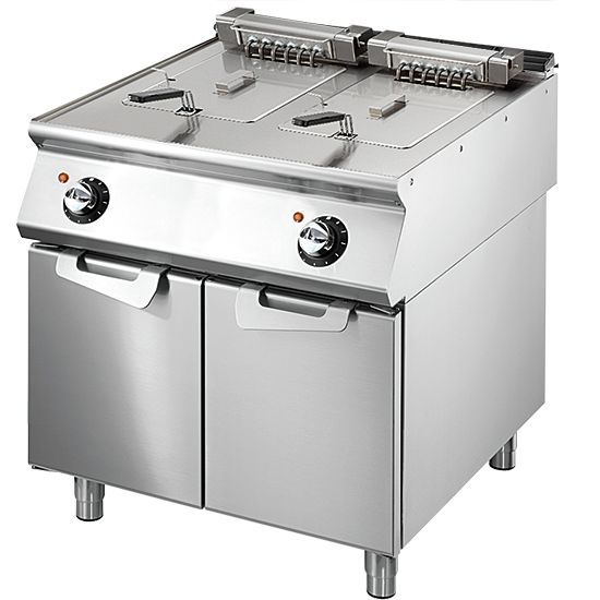 Panneaux latéraux, fond et dos en acier inoxydable. Plateau en acier inoxydable AISI 304 épaisseur 20/10. Puits emboutis en acier inoxydable AISI 304 avec vanne de vidange d'huile installée dans l'armoire inférieure et zone froide pour la collecte des particules alimentaires. Éléments chauffants situés à l'intérieur du puits.Éléments chauffants situés à l'intérieur du puits et relevables pour un nettoyage facile du puits. Contrôle de la température par thermostat mécanique avec réglage jusqu'à 190°C. Thermostat de sécurité à réarmement manuel. Lampe sur le panneau de commande pour indiquer l'activation du chauffage. Boutons spécialement conçus pour éviter la pénétration d'eau dans le panneau de commande.Inclus: Paniers et tube d'extension de vidange d'huile.