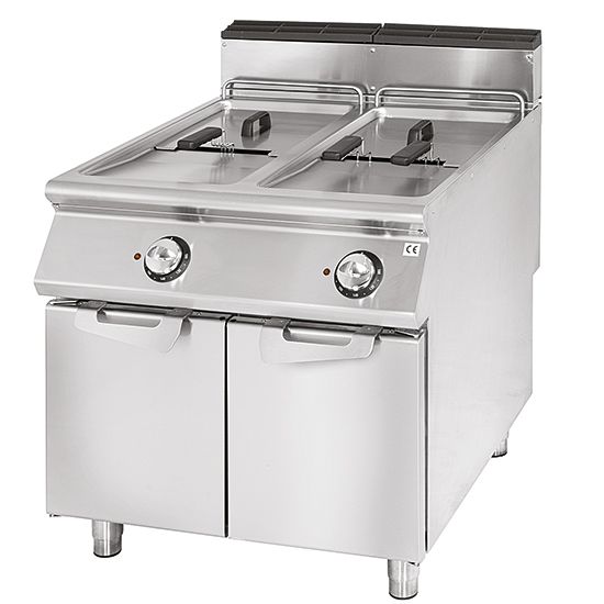 Panneaux latéraux, fond et dos en acier inoxydable. Plateau en acier inoxydable AISI 304 épaisseur 20/10. Puits emboutis en acier inoxydable AISI 304 avec vanne de vidange d'huile installée dans l'armoire inférieure et zone froide pour la collecte des particules alimentaires. Éléments chauffants en acier inoxydable AISI 304 situés à l'intérieur du puits. L'élément chauffant peut être tourné de 90° pour un nettoyage facile du puits. Contrôle de la température par thermostat mécanique avec réglage jusqu'à 190°C. Thermostat de sécurité à réarmement manuel. Lampe sur le panneau de commande pour indiquer l'activation du chauffage. Boutons spécialement conçus pour éviter la pénétration d'eau dans le panneau de commande.Inclus: Paniers et bac de récupération d'huile.