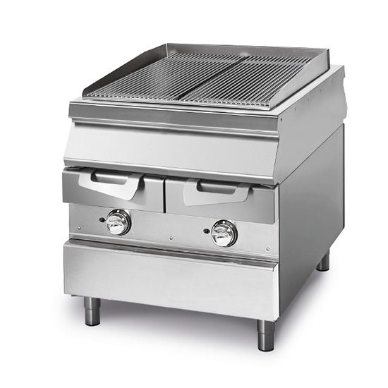Panneaux latéraux, fond et dos en acier inoxydable. Plateau en acier inoxydable AISI 304 20/10. Conduit en fonte émaillée. Grille de cuisson à tiges en acier inoxydable. Pare-éclaboussures à 3 côtés en acier inoxydable AISI 304 et bac de récupération de graisse amovible, remplissable à l'eau pour un nettoyage facile. L'évaporation de l'eau confère la tendreté des aliments grillés. Chauffage par brûleur en acier situé sous la grille de cuisson. Boutons spécialement conçus pour éviter la pénétration d'eau dans le panneau de commande.