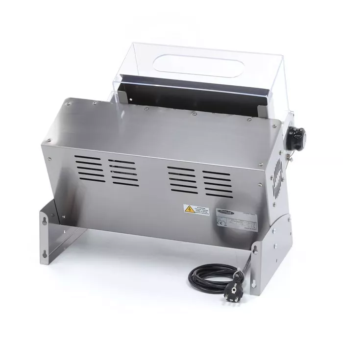 Ce rouleau à fondant simple est équipé d'un moteur durable et puissant. Le rouleau à fondant est doté d'une seule vitesse. Pour travailler en toute sécurité avec ce rouleau à fondant, il est équipé d'un couvercle de protection en plastique transparent et d'un interrupteur de sécurité. Les deux larges pieds en acier inoxydable assurent une bonne stabilité. Le boîtier est entièrement fabriqué en acier inoxydable et est très facile à nettoyer. Vous pouvez retirer les différentes parties de l'appareil et les essuyer avec un chiffon sec. N'utilisez pas d'eau, car les résidus de farine pourraient adhérer à l'appareil.