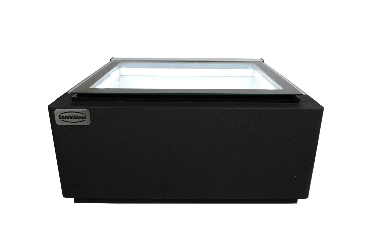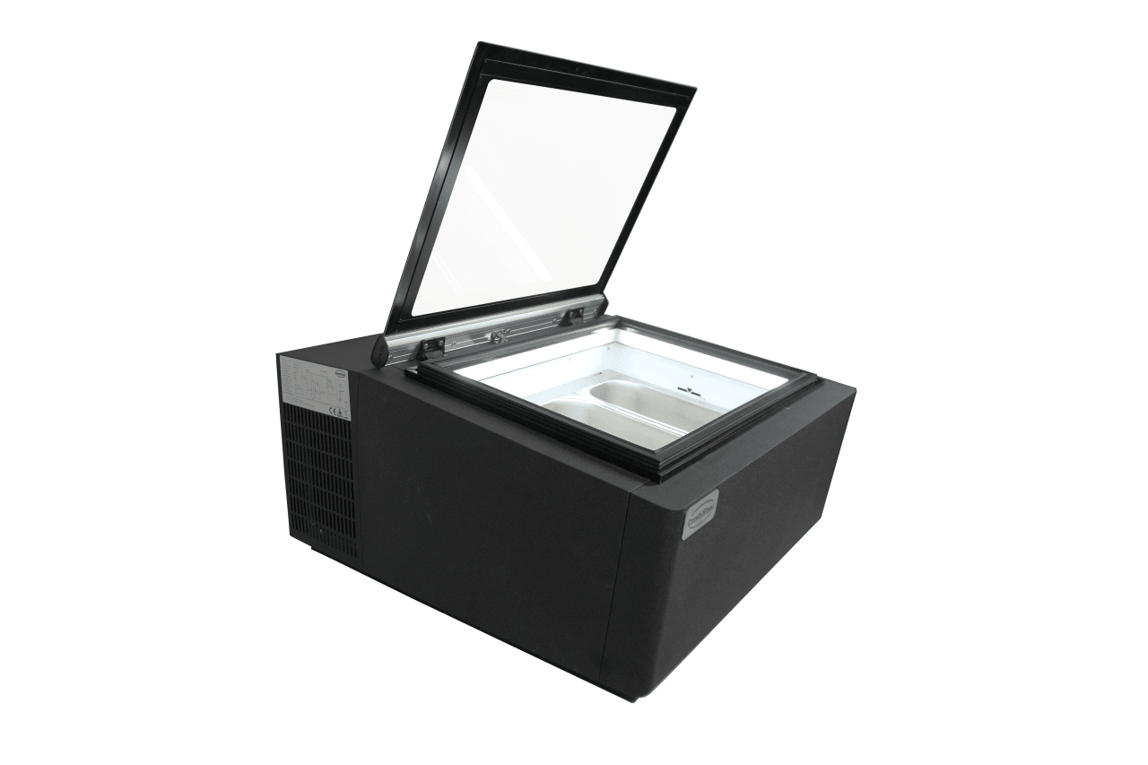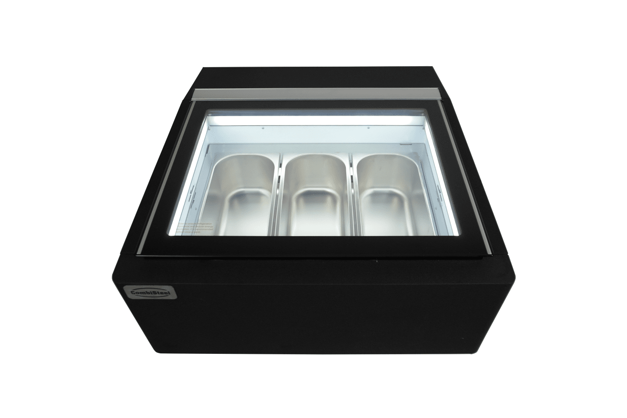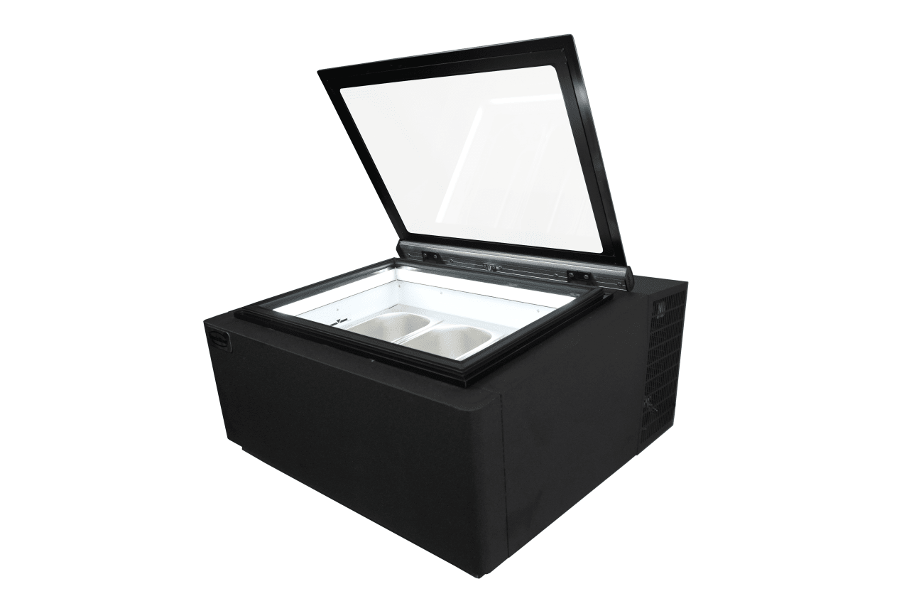 MODÈLE DE TABLE VITRINE À CREME GLACÉE NOIR S'OUVRE DU CÔTÉ CLIENT