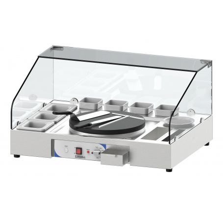 - Acier inoxydable - Vitre de protection en verre trempé amovible - Crêpière électrique Ø400 mm encastrée - Inclus : 7 pots en porcelaine, 1 support pour tampon en porcelaine, 1 râteau aluminium, 2 spatules - Bouton ON/OFF - Thermostat réglable de 140°C à 300°C - Thermostat de sécurité - Puissance : 2 700 W / 230 V - Dimensions : L 900 x P 650 x H 465 mm - Poids : 37 Kg