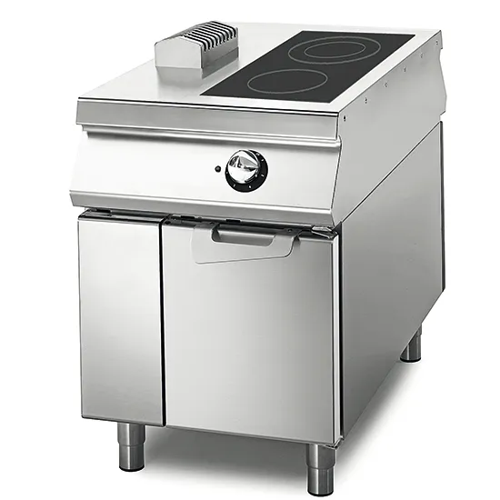 Plaque induction avec 2 plaques sur coffre avec portes, tableau de contrôle sur deux côtés de la marque Virtus, fabriqué en acier inoxydable de haute qualité.
