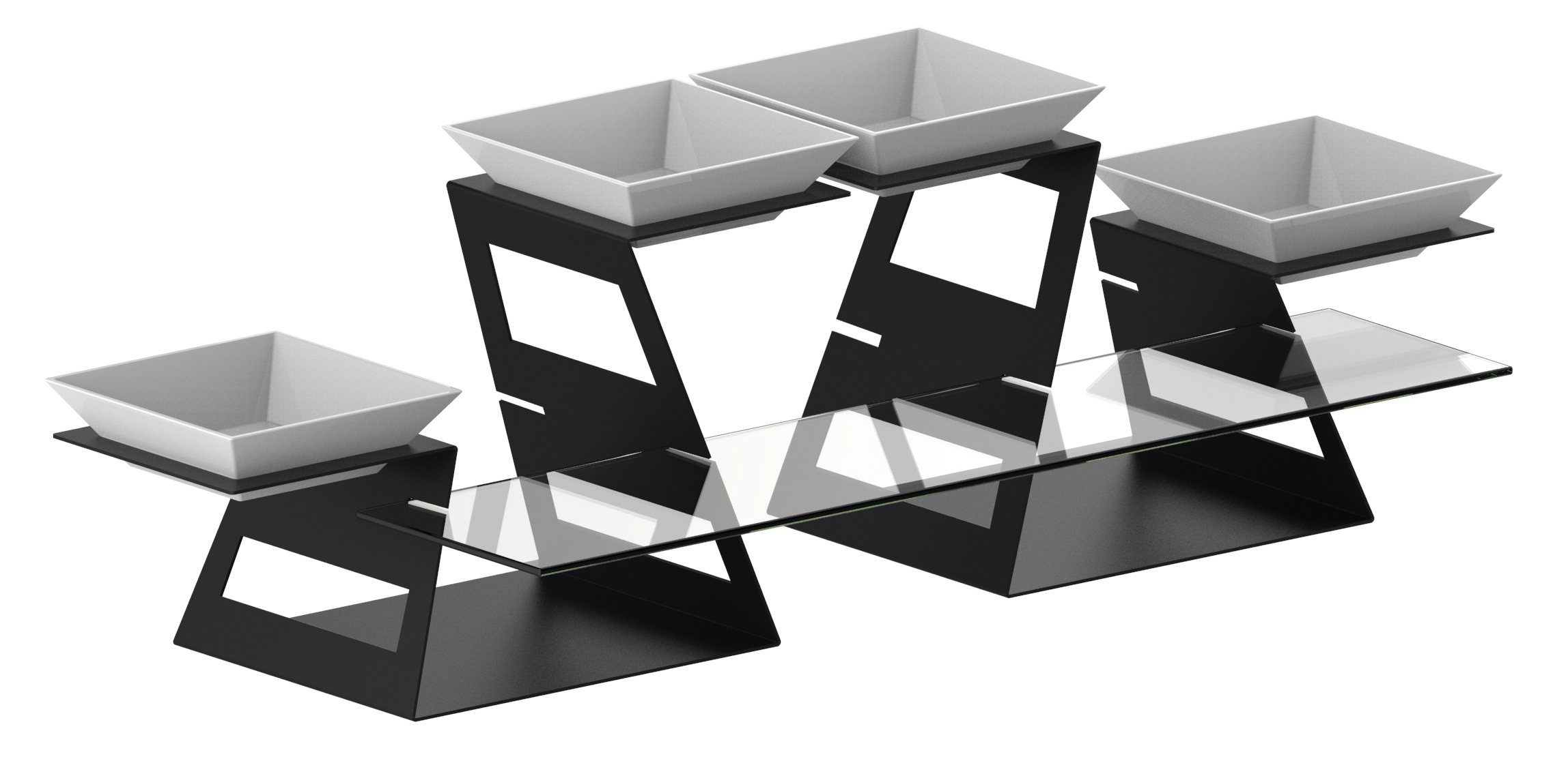 - Acier peint à l'époxy noir - 4 assiettes porcelaine 200 x 200 x 60 mm - 1 plaque en verre trempé -