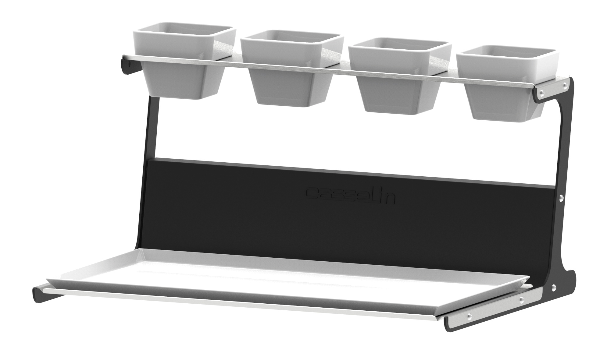 - Support en acier peint à l'époxy noir - Plaque en acier inoxydable - 1 assiette porcelaine L 530 x P 325 x H 13 mm - 4 ramequins porcelaine L 110 x P 110 x H 85 mm -