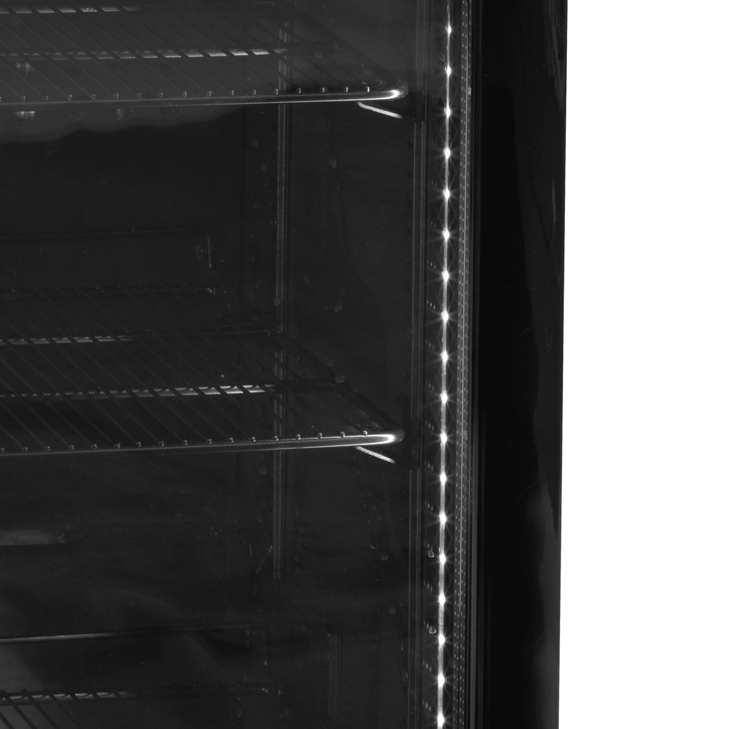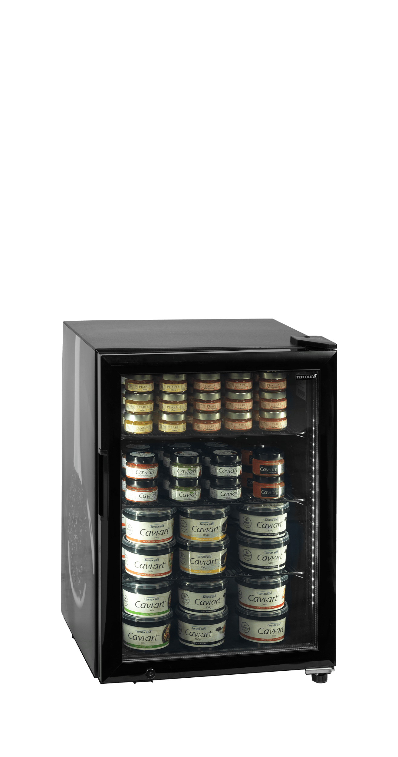 UR90G-SUB ZERO est un congélateur table top optimisé pour la conservation au frais du caviar, mais il convient aussi aux boissons faiblement alcoolisées. Ce modèle dispose d'un thermostat électronique et d'un thermomètre pour éviter d'exposer le très sensible caviar à des températures inadaptées. Dans l'idéal, le caviar doit être conservé entre -6 et 0 °C. Un réfrigérateur ordinaire est trop chaud et un congélateur ordinaire trop froid. Conservé à des températures inadaptées, le caviar perd son niveau de qualité. Un système de froid ventilé garantit une température stable et uniforme sur toutes les tablettes. Pour des raisons de sécurité, le thermostat est situé à l'arrière de l'appareil : ainsi, il n'est pas possible de modifier la température accidentellement. En plus de l'ergonomie et de la qualité, nous avons mis l'accent sur l'effet visuel. L'appareil possède un design élégant et soigné, avec un éclairage LED interne dans une couleur froide. Il est noir aussi bien à l'intérieur qu'à l'extérieur. Il est doté d'un double vitrage chauffé sur la porte afin d'éviter l'apparition de buée après ouverture de la porte. Le contenu est bien mis en valeur.