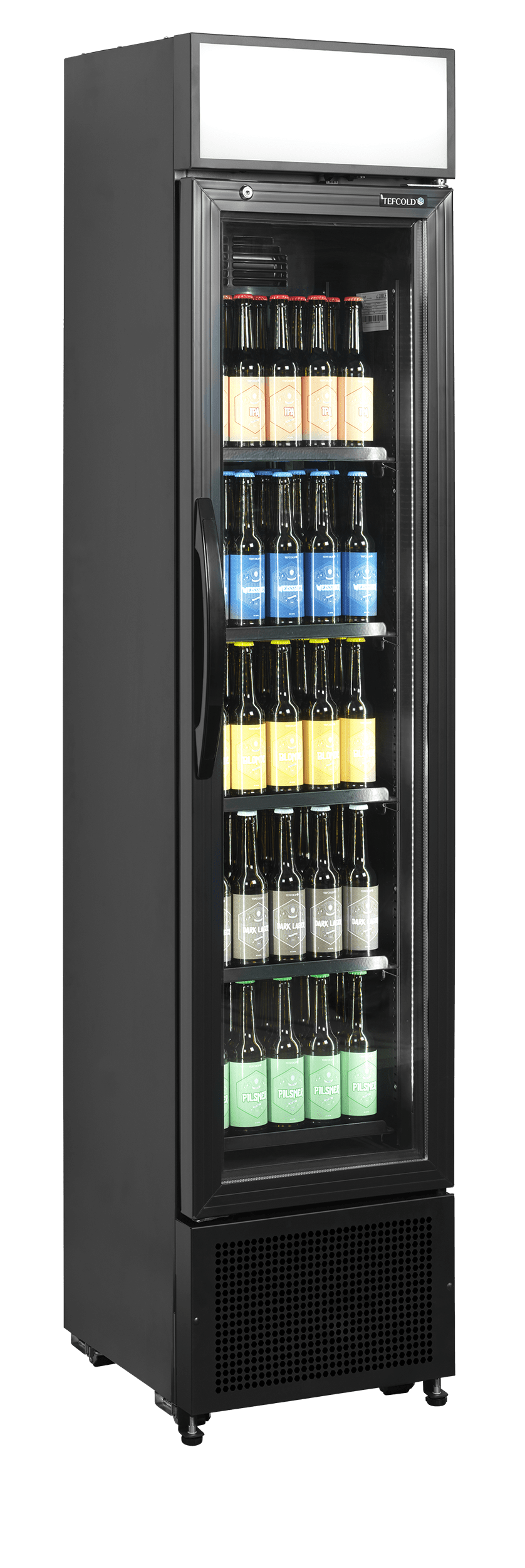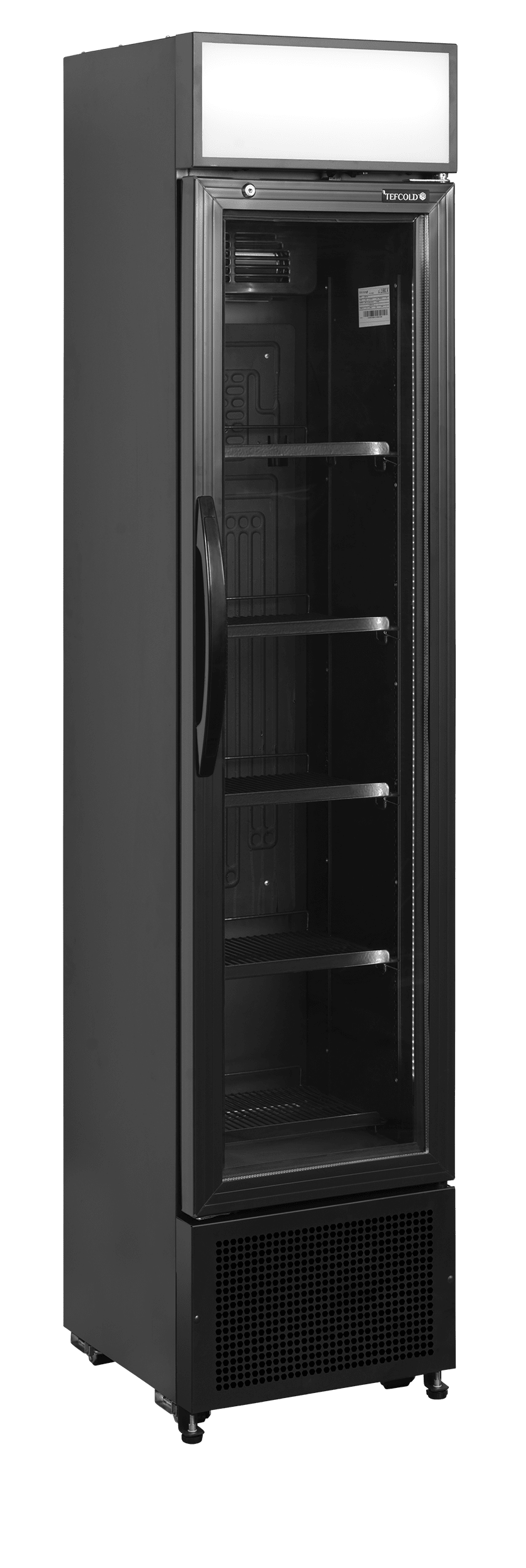 Notre modèle compact FSC175H fait seulement 435 mm de large. Il est désormais disponible en noir. C'est un réfrigérateur à boissons à porte vitrée idéal pour augmenter vos ventes même quand l'espace est limité. Il est fourni avec 5 clayettes grilles noires réglables, 2 éclairages LED verticaux sur toute la hauteur du cadre de porte, et un caisson lumineux à LED. La finition extérieure noire est élégante, et la finition intérieure en noir permet de mettre les produits en valeur, notamment grâce à l'éclairage LED. Cet appareil est idéal pour les cafés, épiceries et pâtisseries haut de gamme. Il convient parfaitement au branding.