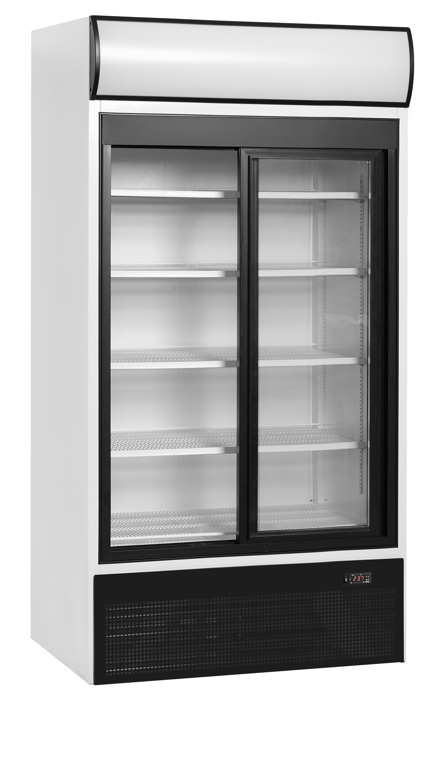 La gamme FSC est équipée d'un caisson lumineux. Un branding personnalisé attire l'œil et encourage les achats impulsifs. L'appareil maintient les boissons au froid tout en mettant les produits en valeur. Ce modèle rencontre un grand succès dans les petits magasins, les épiceries et les supermarchés. Il est proposé par défaut avec intérieur et extérieur blancs. Il est fourni avec 5 clayettes grilles réglables blanches, 2 portes coulissantes vitrées à fermeture automatique, 2 cordons LED verticaux dans l'armoire, et un caisson lumineux à LED.