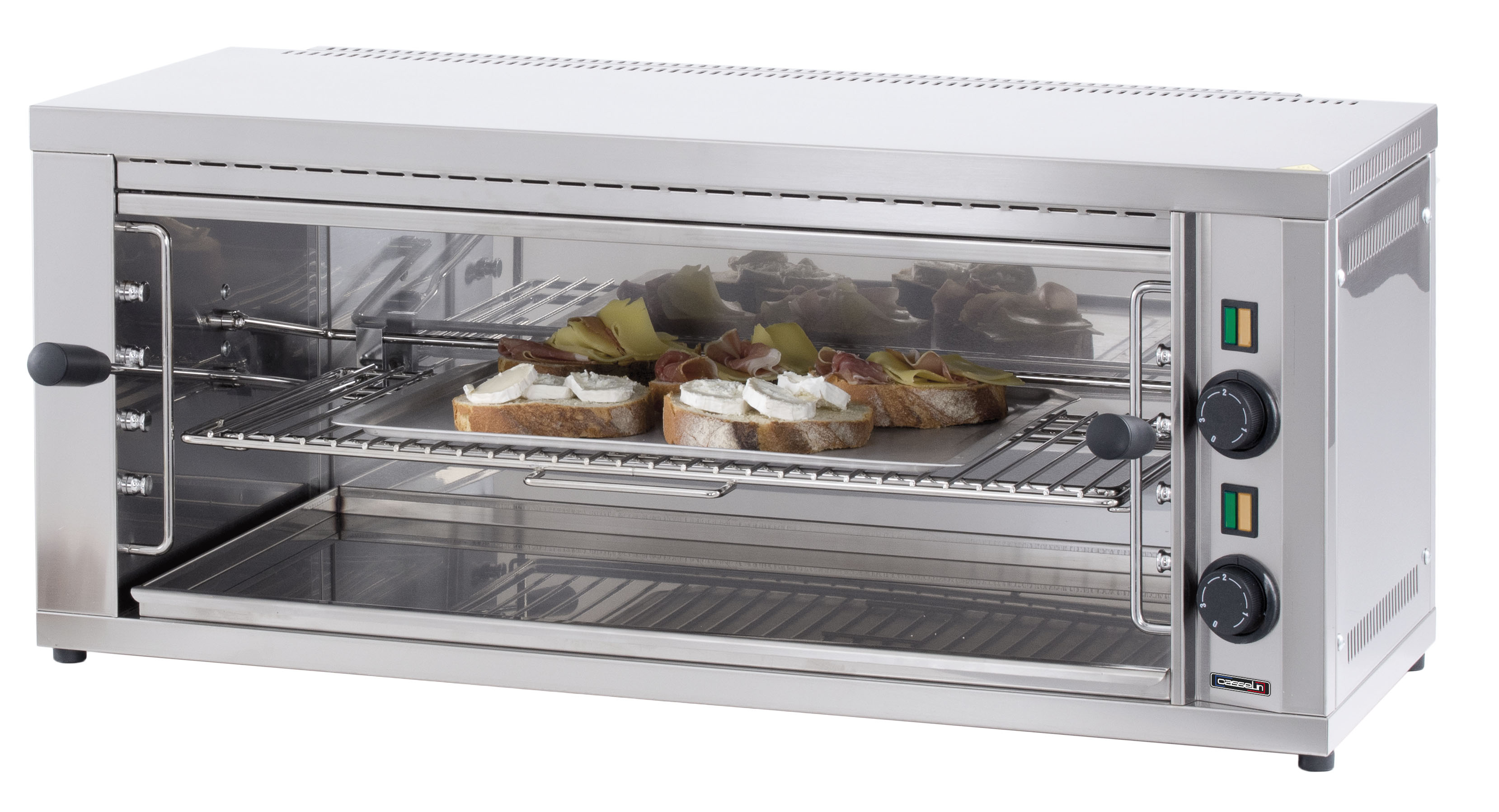 - Acier inoxydable - 2 thermostats réglables - 2 résistances en Incoly 800 - Tiroir de récupération - Hauteur de grille réglable sur 4 niveaux - Possibilité d'ouvrir la face arrière pour passe-plat - Dimensions grille : L 645 x P 300 mm - Puissance : 3 200 W / 230 V - Dimensions : L 875 x P 370 x H 365 mm - Poids : 27,7 Kg