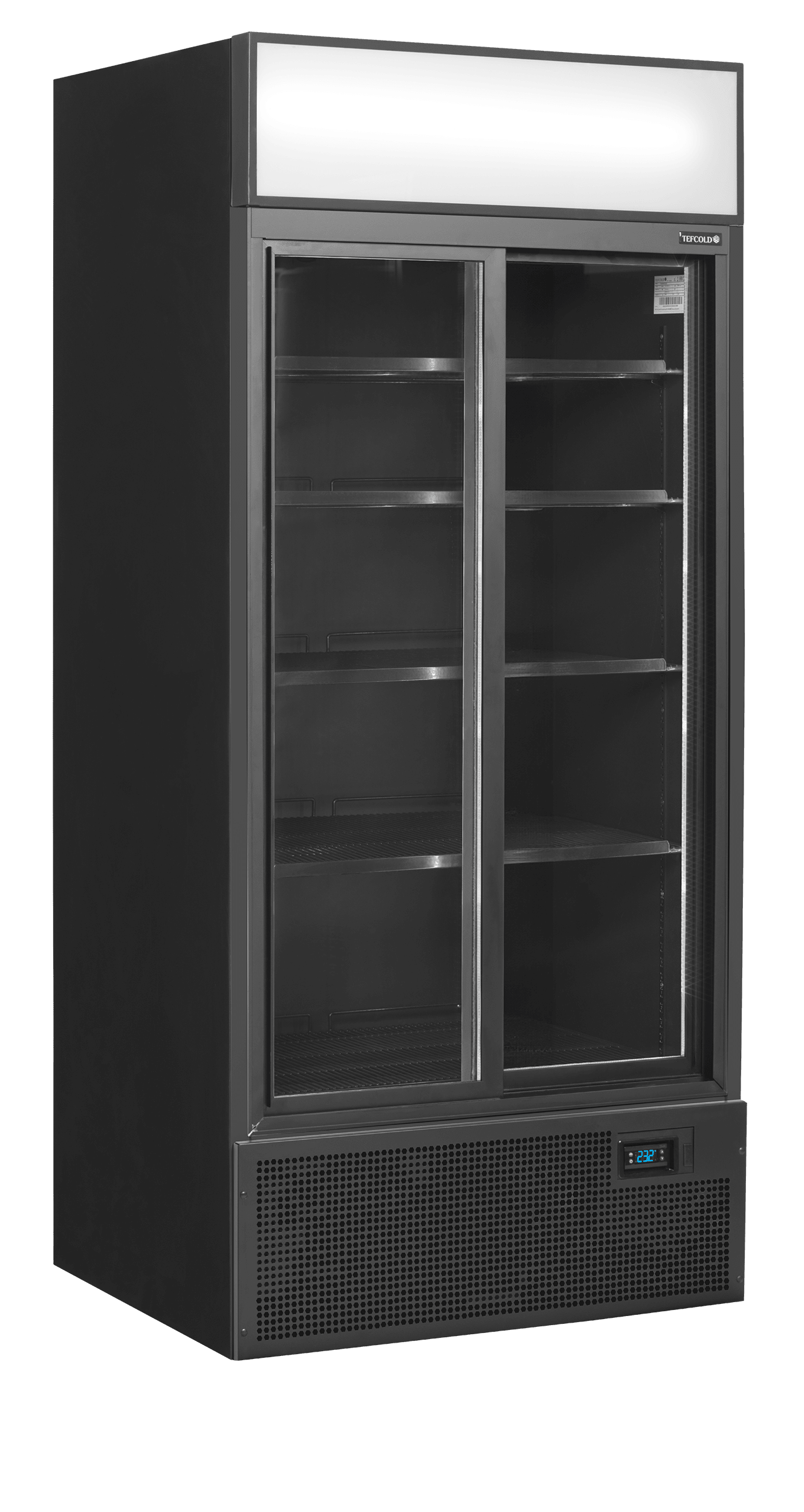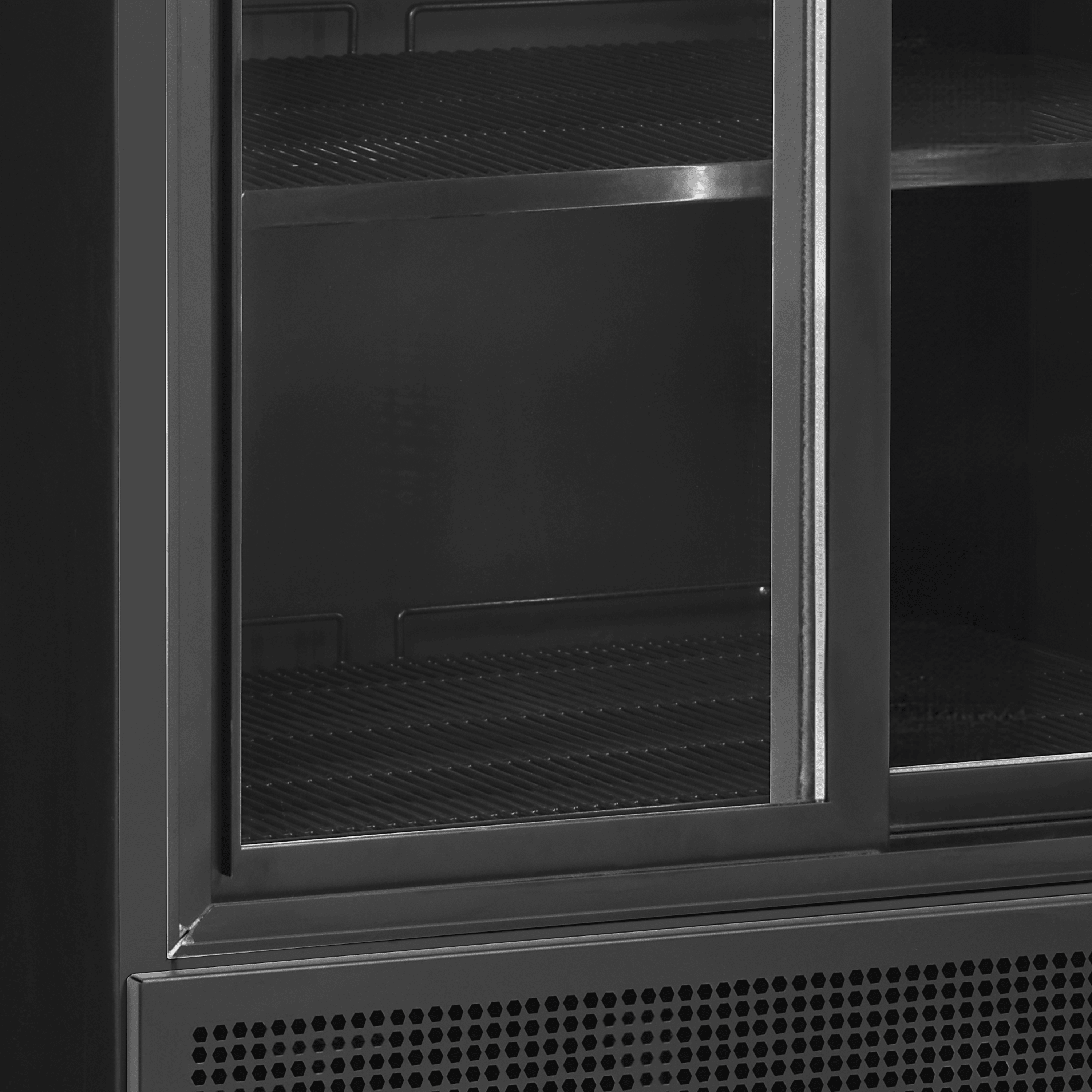 La gamme FSC est équipée d'un caisson lumineux. Un branding personnalisé attire l'œil et encourage les achats impulsifs. L'appareil maintient les boissons au froid tout en mettant les produits en valeur. Ce modèle est doté d'un intérieur et d'un extérieur noirs. La finition extérieure noire est élégante, et la finition intérieure en noir permet de mettre les produits en valeur, notamment grâce à l'éclairage LED. Cet appareil est idéal pour les cafés, épiceries et pâtisseries haut de gamme. Il est fourni avec 5 clayettes grilles réglables noires, 2 portes coulissantes vitrées à fermeture automatique, 2 cordons LED verticaux dans l'armoire, et un caisson lumineux à LED.