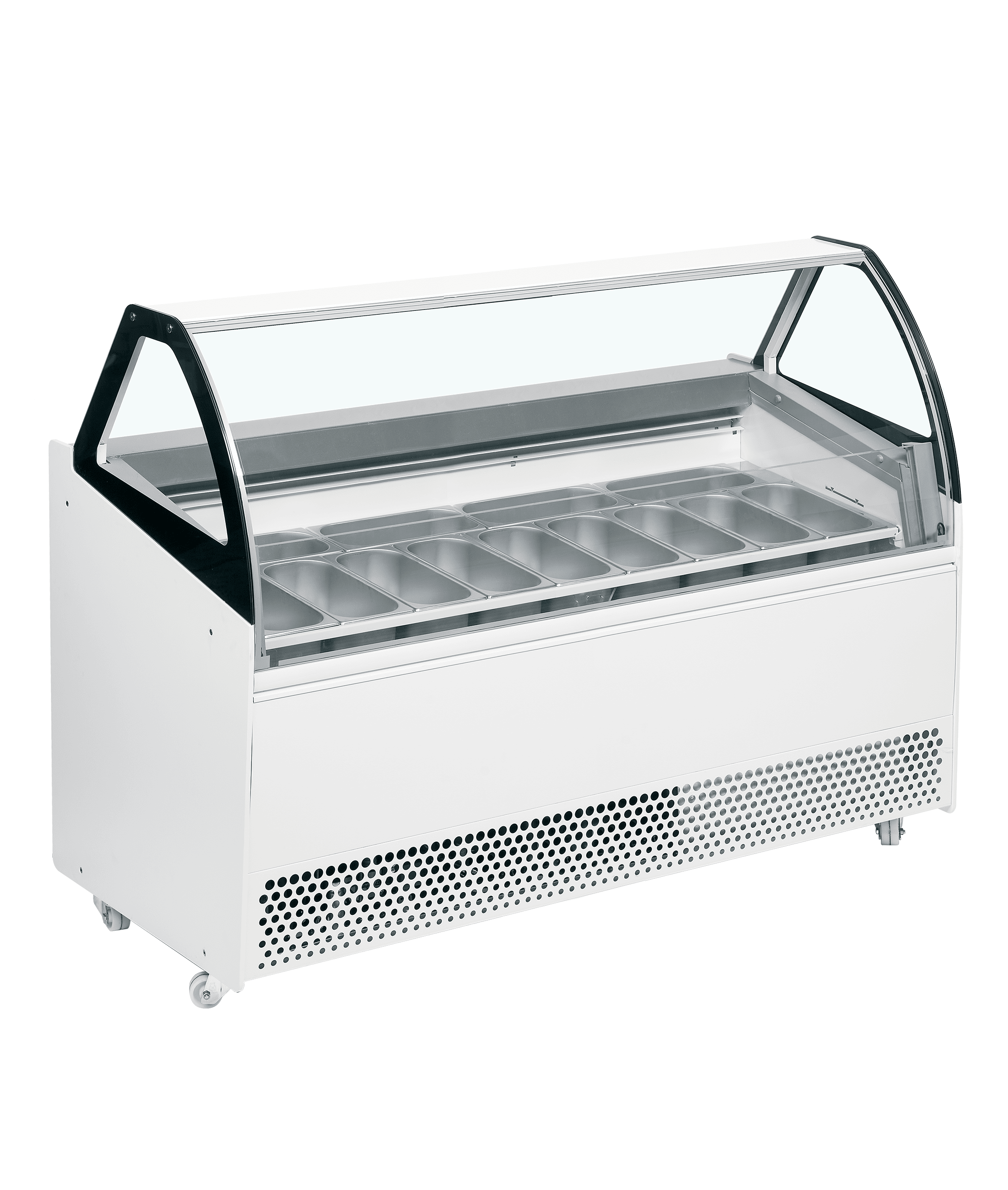 Le coffre pour glace en bac Bermuda View RV10 peut loger 10 bacs Napoli. Son système de froid ventilé permet de maintenir vos glaces ou gelati à la température de service idéale. Le coffre est également équipée d'un compartiment de stockage réfrigéré en-dessous, pour permettre de réapprovisionner rapidement la vitrine sans devoir quitter son poste. La gamme Bermuda View vise avant tout à mettre la glace en valeur. Sa façade abaissée offre une meilleure vue sur les produits. Le modèle Bermuda présente une belle façade incurvée, à la fois pratique et élégante. Celle-ci est chauffée pour éviter la condensation. Cet appareil est équipé de roulettes pour pouvoir le déplacer facilement et d'un éclairage intérieur à LED pour mettre vo produits en lumière avec élégance. Grâce à un rapport qualité/prix exceptionnel, la gamme Bermuda connaît un grand succès auprès des glaciers.
